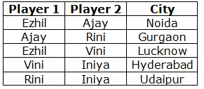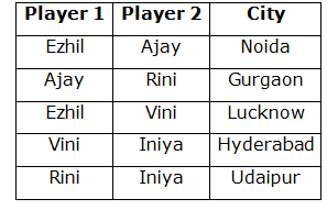 Five persons from the table tennis academy-Ezhil, Iniya, Ajay, Rini, and Vini participated in a doubles table tennis competition. A pair among the five participated in a match on each day in different cities viz., Lucknow, Noida, Udaipur, Hyderabad and Gurgaon. In some of the cities, they are not able to win the match but after the tournament gets over, each person returns with the winning trophy. Each person wins the trophy in only two different cities.