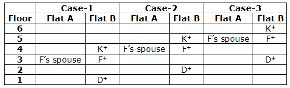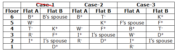 Six couples are living in a six-storey building such that the bottommost floor is numbered as one and the floor immediately above it is numbered as 2 and so on.