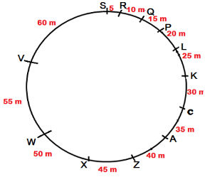 Certain persons are sitting around a circular table which has a circumference of 390 m and all of them are facing towards the centre. They are sitting at certain distances from each other, which are consecutive multiples of 5 in clockwise direction. K is not an immediate neighbour of R. Distance between S and Z is more than 100 m, but less than 110 m. L is sitting second to the left of V, who is sitting 30 m away to the left of X. Distance between R and P is 90 m. K is sitting 2nd to the right of Q. Distance between A and W is the LCM of 5 and 2. Distance between C and K is 75 m. Number of persons sitting between S and Z is one less than the number of persons sitting between A and R. Distance between Q and K is 95 m. Z is the neighbour of both Q and K.