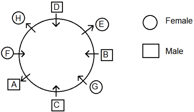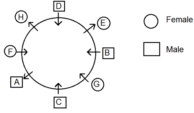 A, B, C, D, E, F, G and H are eight friends that are sitting around a circular table, not necessarily in the same order. Three of them are facing outwards, while five are facing the centre. There are equal number of males and females in the group.