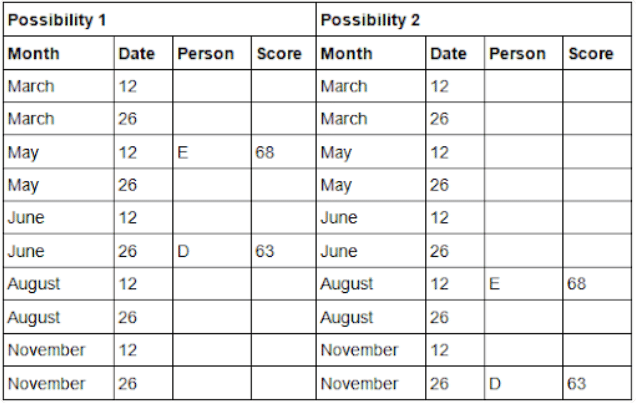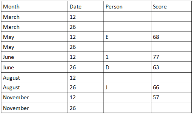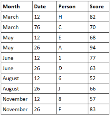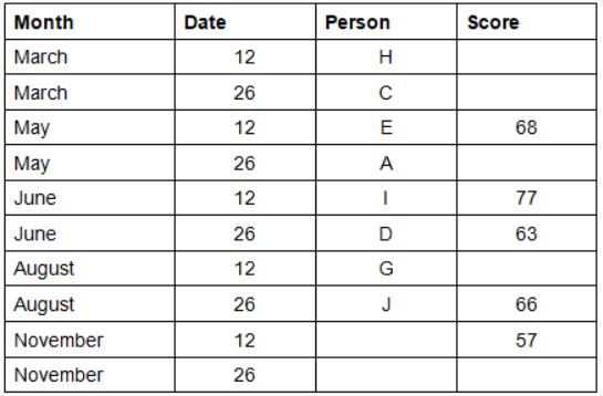 Ten students, namely, A, B, C, D, E, F, G, H, I and J participated in quiz shows. The quiz shows were held on the 12th and 26th of five different months (March, May, June, August and November). Score obtained by a student on a given date was even in the months with 31 days and odd in the months with 30 days. Only one of the students participated on a particular date. No two students obtained the same score.