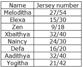 II. If the number of letters in the person’s name is odd, then their jersey numbers are obtained by multiplying the total number of letters of their name by either 3 or 6. (E.g) The total number of letters in the name is 3. Then the person’s jersey number is either ‘9’ or ‘18’.