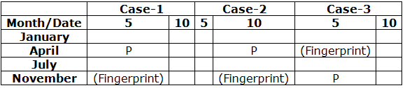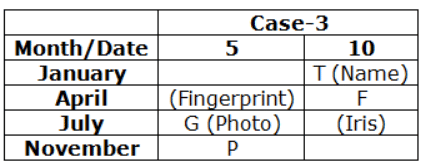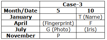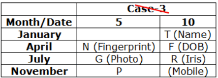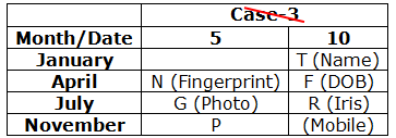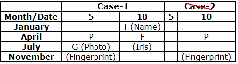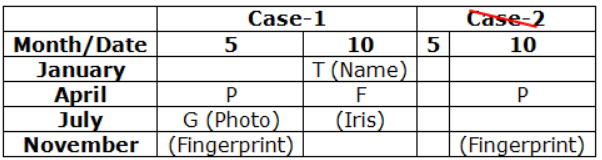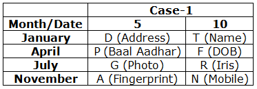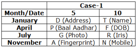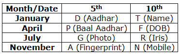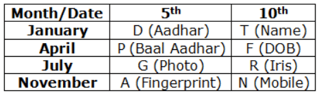 Eight persons A, D, F, G, N, P, R and T are attending E-Aadhar camp on two different dates i.e. 5 and 10 of four different months viz. January, April, July and November for updating eight different Aadhar details viz. Name, Mobile number, DOB, Address, Fingerprint, Photo, Iris and Baal Aadhar but not necessarily in the same order.
