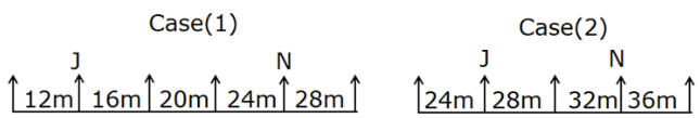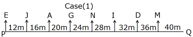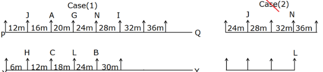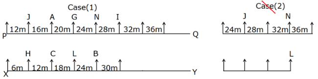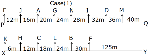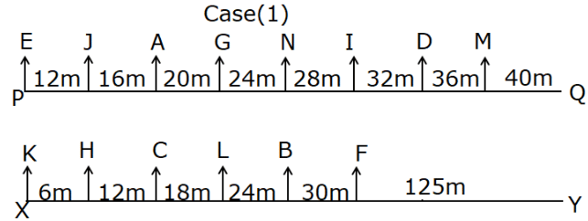 Fourteen persons are sitting in two parallel rows viz.- PQ and XY as shown in the below diagram facing north. The distance between the adjacent persons in line PQ is a consecutive multiple of ‘4m’ whereas in line XY is a consecutive multiple of ‘6m’ from the left end. Distance between none of the adjacent persons is more than 40m.