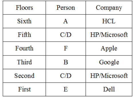 A, B, C, D, E and F are six persons that live in a six storey building on different floors. Ground floor is named as first floor and floor above the ground floor is named as second floor and so on. They work for different companies, i.e HCL, Dell, Microsoft, Google, Apple and HP. F lives on the floor which is three floors above the floor of E, who lives on an odd numbered floor. There are two floors between the floors of C and D. C and D work for Microsoft and HP.