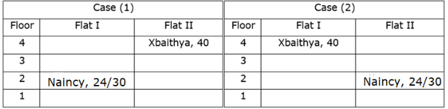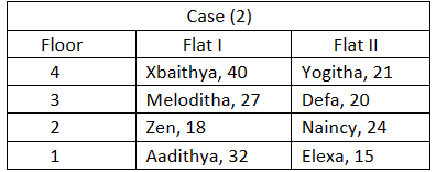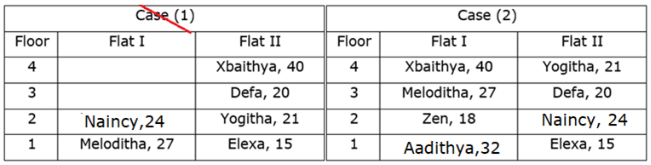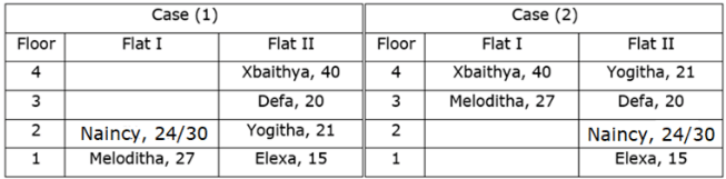 Eight persons – Meloditha, Elexa, Zen, Xbaithya, Naincy, Defa, Aadithya, and Yogitha are living in a four floor building marked 1 to 4 from bottom to top respectively. There are two flats on each floor viz.- flat I and flat II from west to east respectively. Each person wears a jersey with different numbers printed on the back.