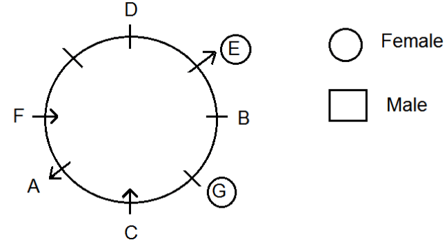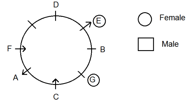 C is facing the centre. E is sitting third to the right of C. F is sitting third to the left of E. Three persons are sitting between F and B. The immediate neighbours of B are females. G is sitting third to the right of F. D is sitting third to the right of A. A is not an immediate neighbour of E. The immediate neighbours of E are males and are facing the centre. The immediate neighbours of D are females and are facing outwards. The one sitting third to the left of B is a male. No female is an immediate neighbour of G.