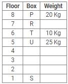 Box V was placed at one of the even numbered shelves and contained 17 kg of Sugar. The box which was placed on 6th shelf contained 10 kg of Sugar. Box Q was placed immediately below the box which contained 8 kg of Sugar and immediately above the box which contained 2 kg of Sugar. Box R was not the lightest and Box U, was the heaviest. Box R was placed above the shelf on which Box U was placed but not on the even numbered shelf. Box P, contained 20 kg of Sugar, and was placed either at the top or bottom shelf. There are three boxes between Box U and Box S and Box S was placed below the shelf on which Box U was placed. T was placed immediately above the box which was heaviest.