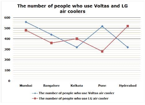 The given line graph shows the number of people who use two different air coolers i.e. Voltas and LG in five different cities (Mumbai, Bangalore, Kolkata, Pune and Hyderabad).