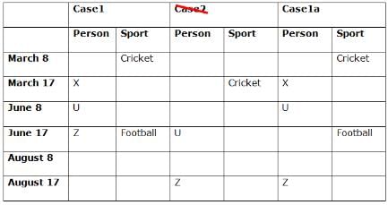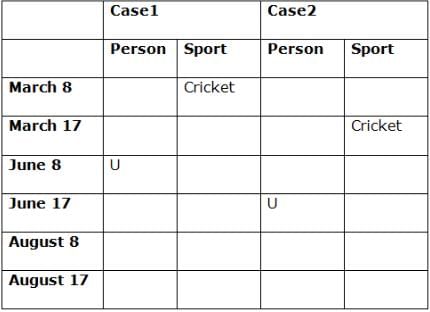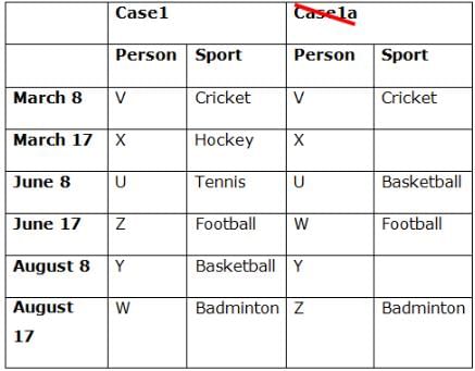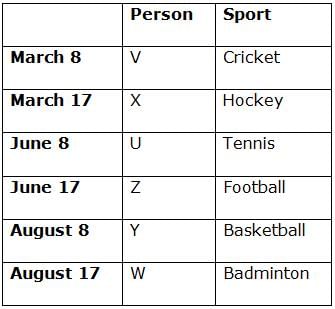 Six persons- U, V, W, X, Y, and Z like different sports-Cricket, Hockey, Badminton, Basketball, Football, and Tennis and they participate in this sports event on two different dates either 8 or 17 of three different months- March, June, and August of the same year. All the information is not necessarily in the same order.