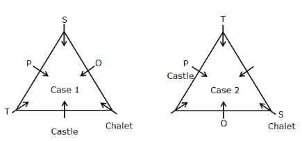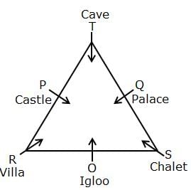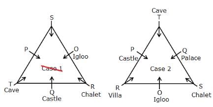 Six persons viz. O, P, Q, R, S, and T are seated at a triangular table such that all of them are facing towards the centre. Each person lives in different types of houses viz. Castle, Cave, Chalet, Igloo, Palace, and Villa. Three persons are seated at the corners of the table whereas three persons are seated at the middle of the side of the table. All the information is not necessarily in the same order