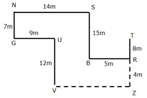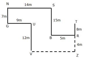 Point N is 7m north of point G which is 9m west of point U. Point S is 15m north of point B. Point R is 8m south of point T. Point B is 5m west of Point R. Point N is 14m west of point S. Point V is 12m south of point U.