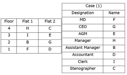 Eight persons namely – B, C, D, E, F, G, H, and I are living on four floored building marked 1 to 4 from bottom to top. There are two flats viz.- flat 1 and flat 2 from west to east. Each person works in the same organization at different designations viz.- MD, CEO, AGM, Manager, Assistant Manager, Accountant, Clerk, and Stenographer. All the information is not necessary in the same order.