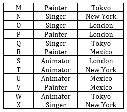 12 people- M, N, O, P, Q, R, S, T, U, V, W and X, live in 4 different cities – London, New York, Mexico and Tokyo. Exactly 3 people live in each of the cities. Exactly 4 persons are Singer, Animator and Painter. M is not an Animator and does not live in New York or Mexico. N is a Singer and R is a Painter. P is a Painter who lives in London. Either U or S live in the same city as V. X who is a Singer lives in New York and W lives in Tokyo. T is an Animator who lives in New York. There are two Painters who live in Mexico and two singers who live in New York. All the Animators are living in different cities. All the persons from Tokyo have different professions. O and S both live in London. U & V are not Singers and both have different professions. Q is a Singer and does not live in New York. O is not an Animator. M and V have same professions.