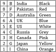 Nine people A, B, C, D, E, F, G, H and I, stay in a building. The building has nine floors and only one person stays on one floor. Each of them likes different colors namely-Red, Green, Blue, Black, Yellow, Pink, Orange, White and Grey. Each person belongs to different countries, i.e. India, Canada, US, UK, Pakistan, China, Japan, Russia and Australia, but not necessarily in the same order. The ground floor is numbered 1, the floor above it is numbered 2, and so on, and the topmost floor is numbered 9.