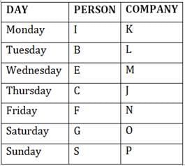 Seven persons B, E, C, S, G, F and I conduct workshop on Developing Production skills in seven different companies J, K, L, M, N, O and P on a different day of the week from Monday to Sunday. The order of persons, companies and days of the week are not necessarily the same.