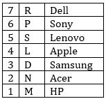Seven friends named– P, R, M, L, D, S and N live on seven different floor of a building, but not necessarily in the same order. The lower most floor of the building is numbered one the above that is numbered two and so on till the topmost floor is numbered seven. Each one of them likes different companies Laptop viz, Samsung, Dell, Lenovo, HP, Acer, Apple and Sony but not necessarily in the same order. Only three people live between R and D. R lives above D. D doesn’t live on lower most floor. Only one people lives between R and the one who likes Lenovo. The one who likes Sony live on an even numbered floor above the one who likes Lenovo. Only two people live between N and the one who likes Lenovo. The one who likes Samsung lives immediately above N. P lives immediately above S. P does not like Lenovo. The one who likes HP lives on an odd numbered floor below S. N does not like HP. L live above M. Only one person lives between the one who likes Acer and the one who likes Apple. L does not like Acer. N does not like Dell.