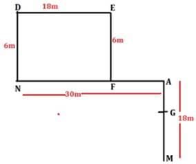 Point A is 18m north of point M. Point N is 30m west of point A. Point D is 6m north of point N. Point D is 18m west of point E and point F is 6m south of point E. G lies 13m to the north of point M.