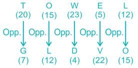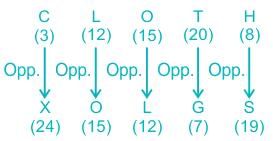 In a certain code language, 'CLOWN' is written as 'XOLDM' and 'TOWEL' is written as 'GLDVO'. How will 'CLOTH' be written in that language?