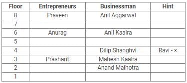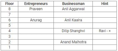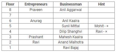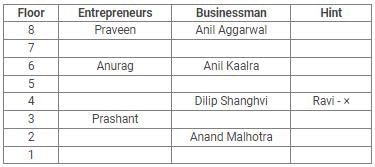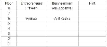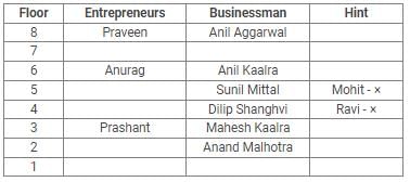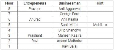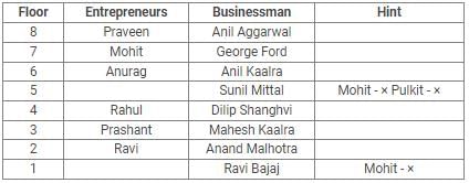 Eight persons are living in an apartment having eight floors. First floor is numbered one; second floor is numbered two and so on till the top-most floor which is numbered eight. There are eight entrepreneurs and eight leading businessmen in the building. On each floor one entrepreneur lives with one leading businessman. The names of the eight entrepreneurs are – Mohit, Ravi, Pulkit, Praveen, Anurag, Nishant, Prashant and Rahul – not necessarily in the same order. The names of the eight businessmen are – Mahesh Kaalra, Sunil Mittal, Anil Aggarwal, Ravi Bajaj, Anand Malhotra, George Ford, Dilip Shanghvi and Anil Kaalra.