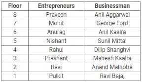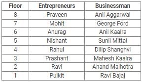 Q. How many entrepreneurs are staying between the floors on which Mahesh Kalra and Mohit live?