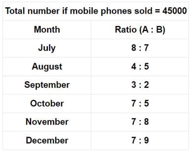Percentage-wise Distribution of the Number of Mobile phones Sold by a Shopkeeper During Six Months. Ratio of mobile phones sold of Company A & Company B.
