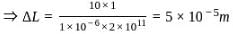 A steel wire of 1 m long and 1 mm2 cross-section area is hanged from the rigid end when the mass of 1 kg is hung from it then change in length will be (for wire Youngs coefficient