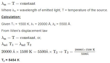 A body at 1500 K emits maximum energy at a wavelength of 20000 Ȧ. If the sun emits maximum energy at a wavelength of 5500 Ȧ, what would be the temperature of the sum?