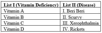 Match the Vitamin deficiencies (List I) with the Diseases (List II):