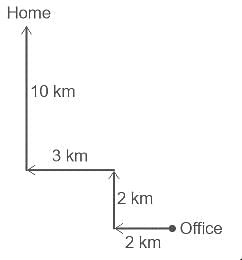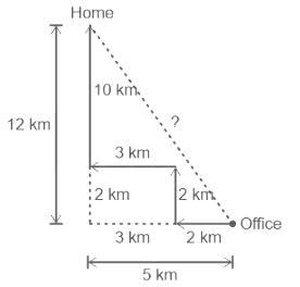 Arpit started from his office and travelled 2 km towards west, then he turned right and travelled 2 km and then turned left and travelled 3 km. From there he took a bus which travelled straight towards north and he travelled 10 km by this us and reached his home. What is the shortest distance between his home and office?