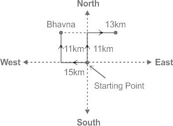 Anurag and Bhavna started driving from the same point. Anurag drove North for 11 km, then turns right and covers 13 km. Bhavna goes West and covers 15 km, then turns right and covers 11 km. How far apart are they from each other in a straight line?