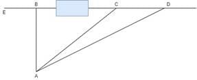 In the figure given below, survey line EB passes through an obstacle. The ∠BAC and ∠BAD are 30o and 45o respectively. If AB is 90 m, what will be the length of AC, AD and obstructed portion BC respectively, such that CD is in line with EB produced?