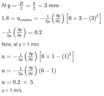 In a laminar flow between two parallel plates with a separation distance of 6 mm, the centre line Velocity is 1.8 m/s. The velocity at a distance of 1 mm from the boundary is: