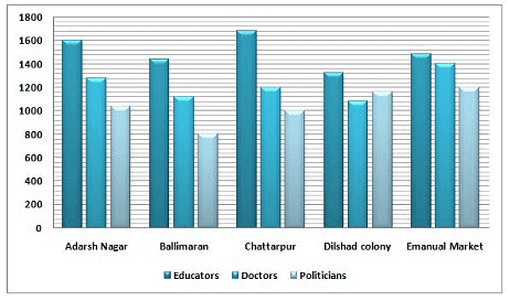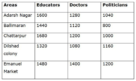 The following Bar graph shows the number of Educators, Politicians and Doctors in five different areas of Delhi