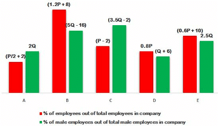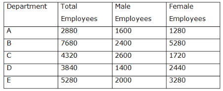 The Bar graph given below shows the % distribution of the total number of employees in a company in five departments and the % distribution of the number of male employees in five departments out of total male employees in the company. The number of female employees in department A and department E is 1280 and 3280 respectively.