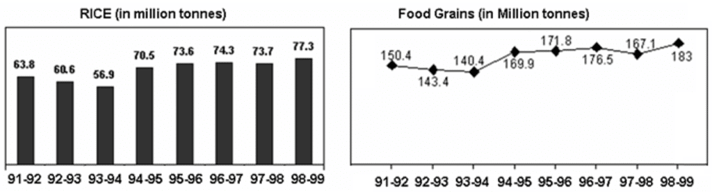 III. Rice production, when compared to the previous year, had decreased in three years during 1991-92 to 1998-99.