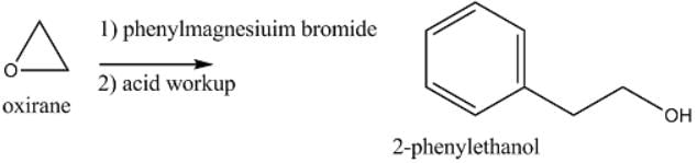 Oxirane (ethylene oxide or epoxide) when treated with phenylmagnesiuim bromide (C6​H5​−Mg−Br) followed by acid workup, will yield 2-phenylethanol.