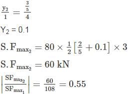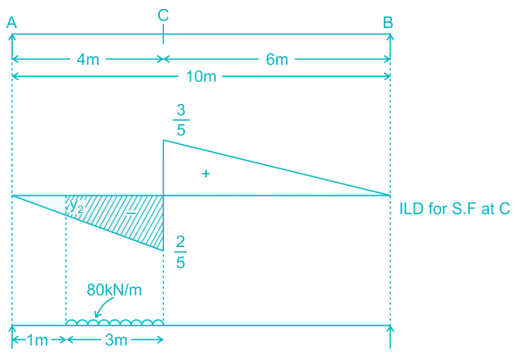A uniformly distributed load of 80 kN per meter run of length 3 m moves on a simply support girder of span 10 m. The magnitude of the ratio of Maximum negative shear force to the maximum positive shear force at 4 m from the left end will be _______ (up to two decimal places).