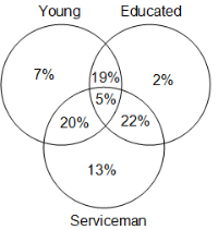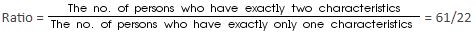 In a town, 48% people are educated, 51% people are young and 60% are servicemen. 24% are educated and young, 25% are young and servicemen, 27% are educated and servicemen and 5% have all the qualities. If the total number of persons in this town is 300, what is the ratio of those who have exactly two characteristics and those who have only one characteristic?