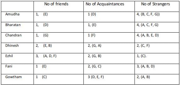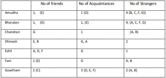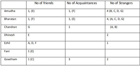 Using statement 4 Every friend of Bharatan is an acquaintance of Amudha, and every acquaintance of Amudha is a friend of Bharatan, Hence the number of acquaintances of Bharatan is equal to the number of friends of Amudha.