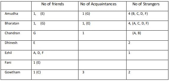 Hence Bharatan has one friend, 1 Acquaintance, 4 strangers.