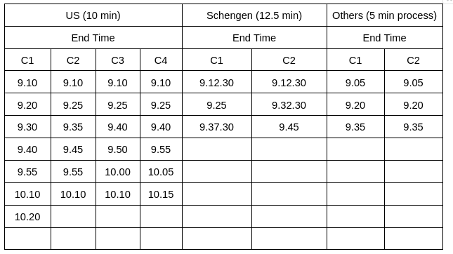 Nandini's position was sixth in the queue in the Schengen Applications. From the table, we can see that her process will end at 9.45 am.