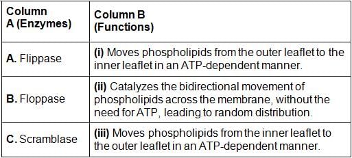 Flippase and floppase are critical for actively maintaining the asymmetric distribution of phospholipids across the cell membrane, an essential feature for cellular function that requires energy in the form of ATP. In contrast, scramblase acts independently of ATP, facilitating a non-selective, bidirectional movement of phospholipids, which can disrupt or alter this asymmetry under specific conditions.Therefore, the correct answer is Option 3 i.e.A-i,B-iii,C-ii