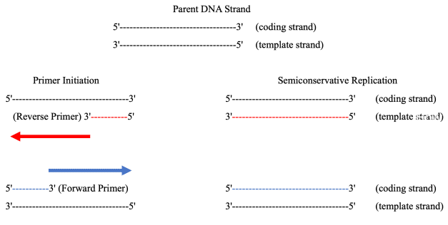 • Forward primer binds to the template strand, moving from 3' to 5'. It attaches to the start codon of the template DNA.
