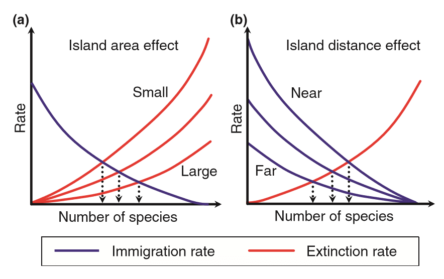A. The theory proposed that the number of species on any island is determine by balance between the rate at which new species colonize it and the rate at which population of established species become extinct.