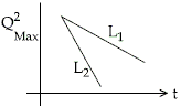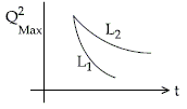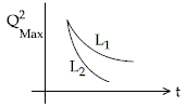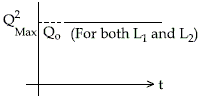 If a student plots graphs of the square of maximum charge on the capacitor with time (t) for two different values L1 and L2 (L1 > L2) of L, then which of the following represents this graph correctly?