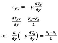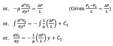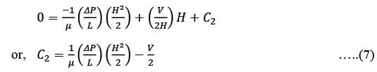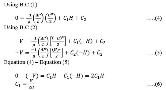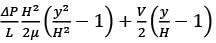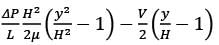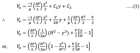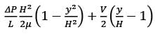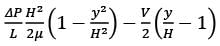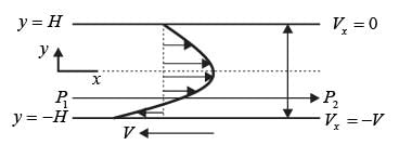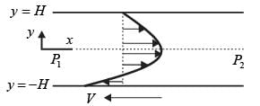Consider a steady, fully-developed, uni-directional laminar flow of an incompressible Newtonian fluid (viscosity μ) occurring between two infinitely long horizontal plates that are separated by a distance of 2H as depicted in the figure. The flow is induced by the combined effects of a pressure gradient and the movement of the lower plate at y = −H in the negative x direction. Given that , where P1 and P2 denote the pressures at two x positions separated by a distance L. The lower plate has a velocity of magnitude V relative to the stationary upper plate at y = H. Which of the following expressions represents the x-component of the fluid velocity vector?