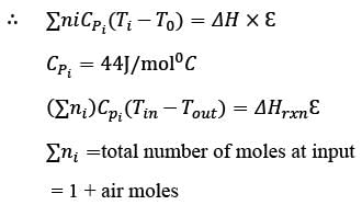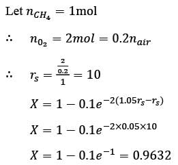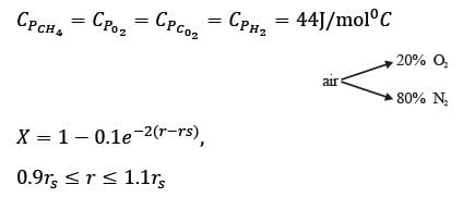 Methane reacts with air in a furnace according to the equation CH4 2O2 → CO2 2H2O, with a heat of reaction ΔHrxn = -880 kJ per mole of CH4, which is considered constant. The furnace is perfectly insulated, and there are no additional side reactions. All substances are treated as ideal gases, exhibiting a constant molar heat capacity of . The composition of air is approximated as 20 mol% O2 and 80 mol% N2. The air-fuel mixture enters the furnace at a temperature of 50°C. The conversion of methane, X, is influenced by the air-to-methane mole ratio, r, as described by