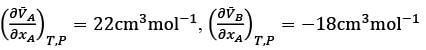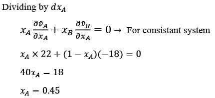 Consider a binary mixture consisting of components A and B at a given temperature T and pressure P. Let represent the partial molar volumes of A and B, respectively. At a specific mole fraction of A, denoted as xA, what is the value of xA, rounded to two decimal places? Where
