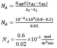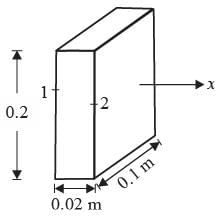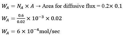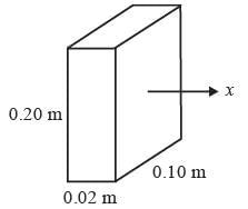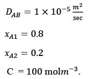 Consider the steady, one-dimensional diffusion of a binary mixture consisting of A and B across a vertical slab measuring 0.2 m x 0.1 m x 0.02 m as illustrated in the figure. The total molar concentration of A and B remains constant at 100 molm−3. The mole fractions of A at the left and right surfaces of the slab are held at 0.8 and 0.2, respectively. Given that the binary diffusion coefficient DAB is 1 x 10−5 m2s-1, determine the molar flow rate of A in mol s−1 along the horizontal x direction.